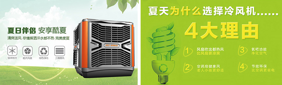 冷风机,又称蒸发冷风机,是一种集降温、换气、防尘、除味于一身的蒸发式降温换气机组。冷风机除了可以让企业车间、公共场所、商业娱乐场合带来新鲜空气和降低温度之外,还有一个重要特点----节能、环保!它是一款全新无压缩机、无冷媒、无铜管的环保产品,主要部件核心-----蒸发式湿帘(多层波纹纤维叠合物)及1.1KW的主电机/是传统中央空调耗电1/8,能为各行业更实在的省电。