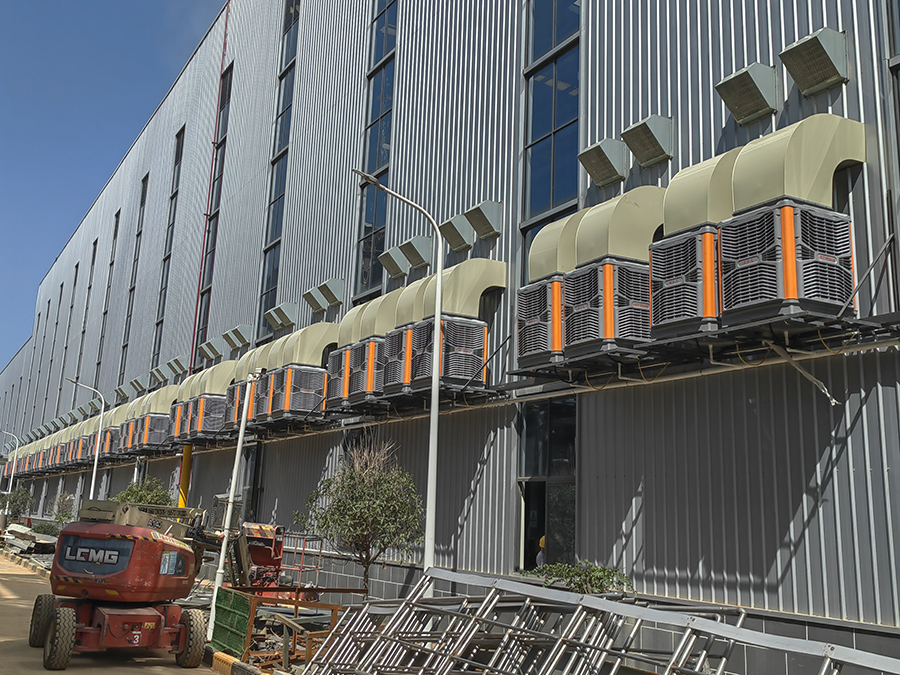 过管道送入车间将室内原有的空气进行置换。车间空间降低4-8度,并且做到良好的通风换气增加空气含氧量的效果,客户对我司产品高度评价!
